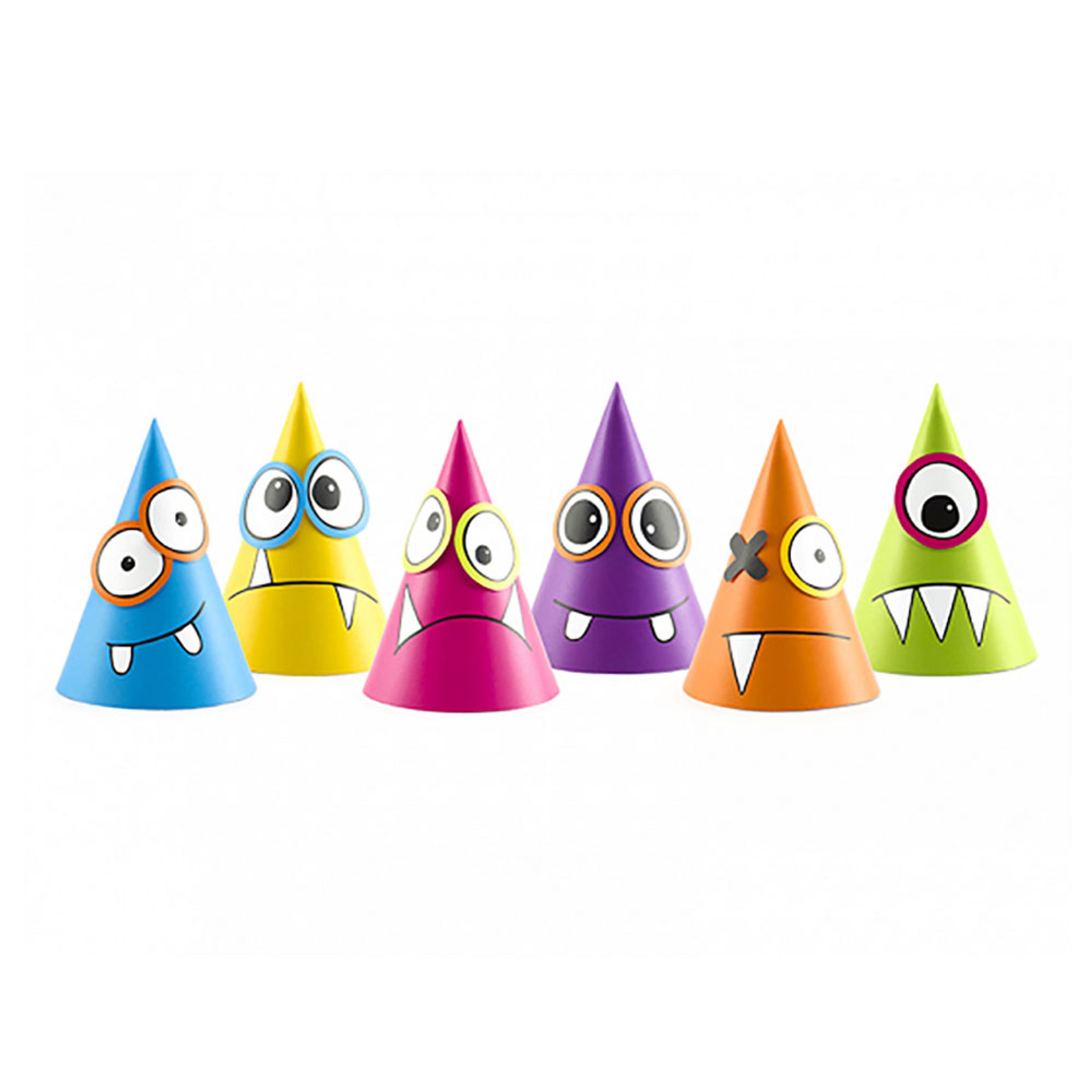 Partyhattar Monster består av sex stycken kalashattar i olika färger, med munnar och tänder, likt monster. Levereras med varierande ögon och dubbelhäftande klisterpuffar som gör att barnen kan skapa sina egna hattar – perfekt till barnkalaset!