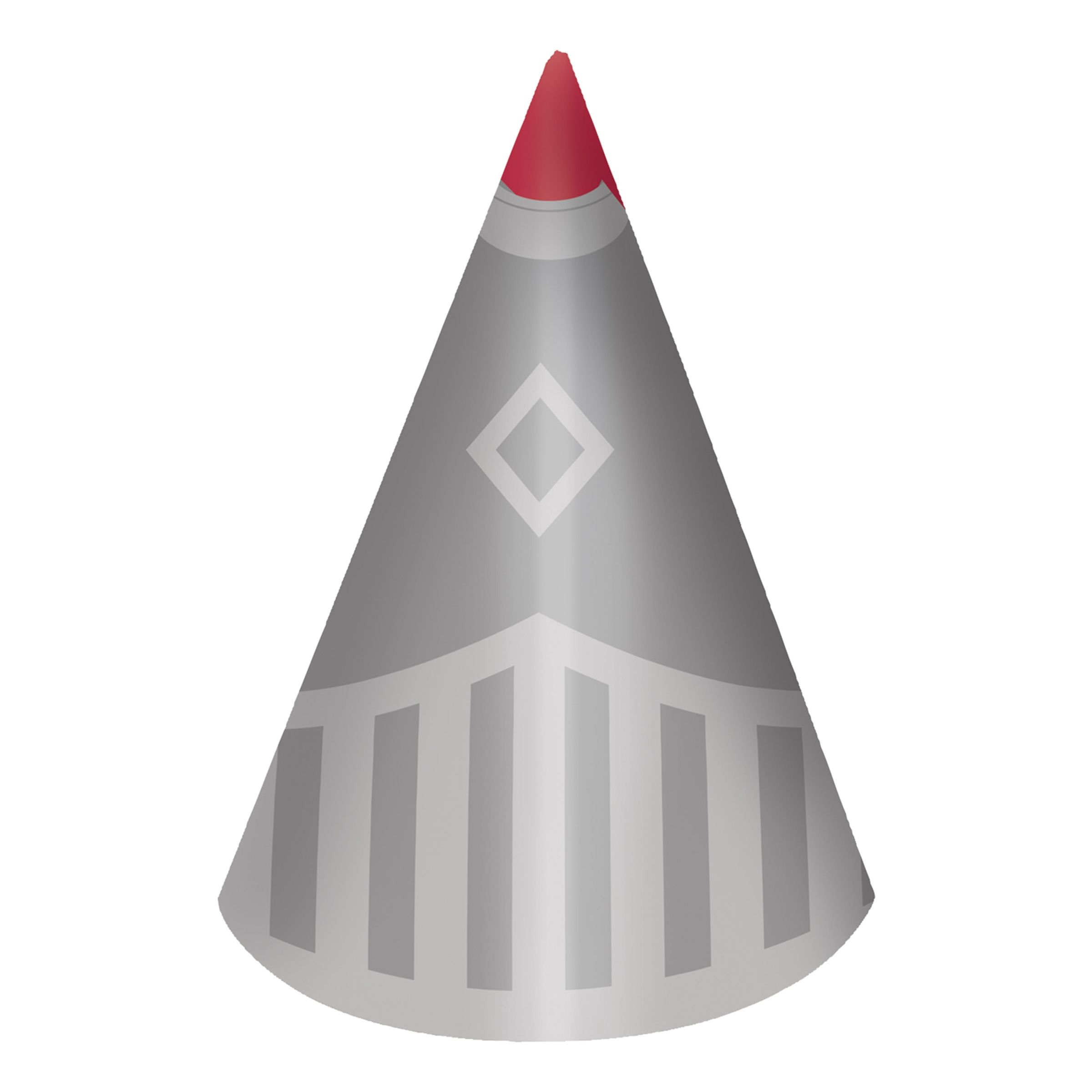 Partyhattar Riddare innehåller 8 stycken partyhattar i papper som samtliga mäter 16 cm och är mönstrad som en riddarhjälm. Varje hatt är försedd med elastiskt band så att hatten stannar på huvudet. Ett måste på barnkalas och andra medeltida event!