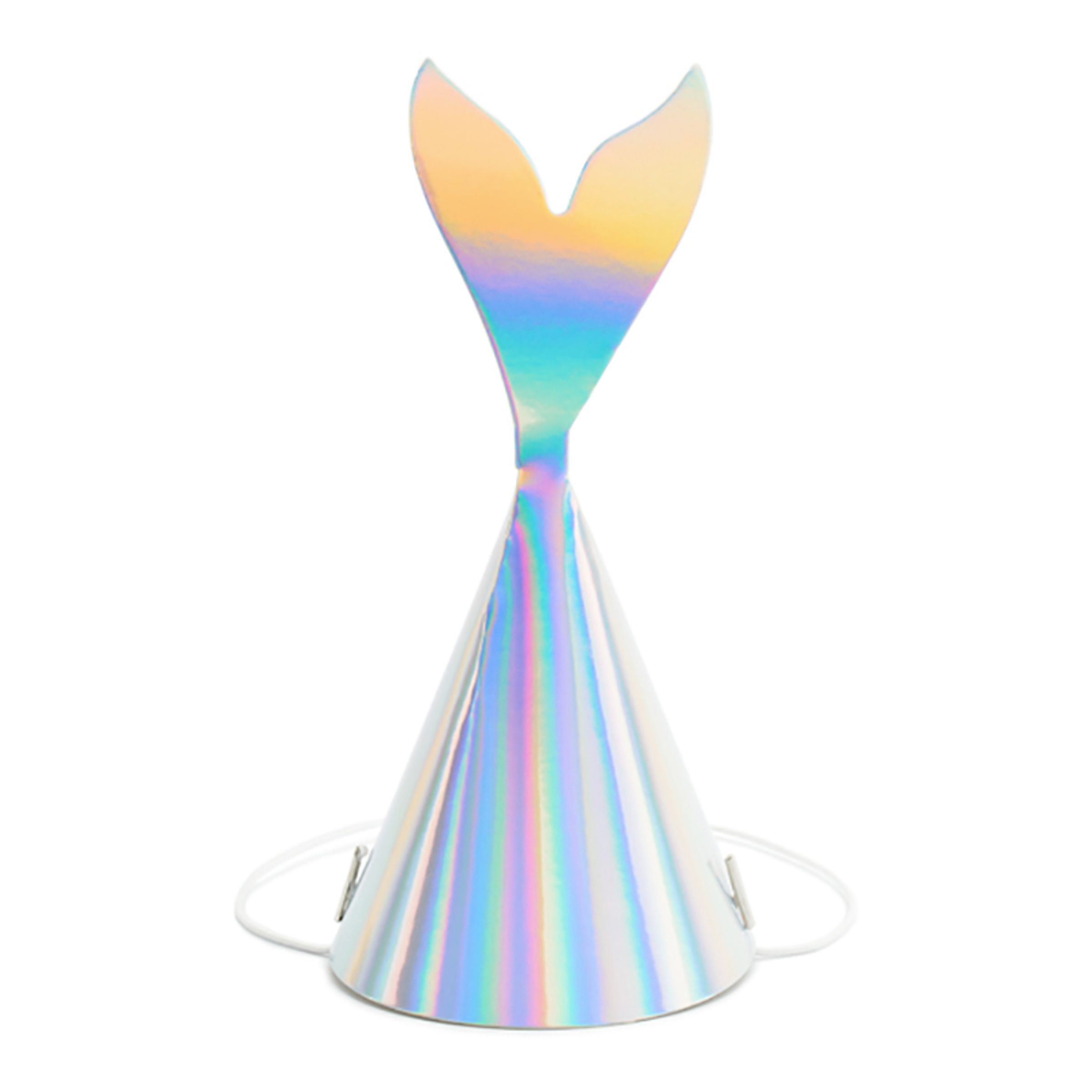 Partyhattar Sjöjungfru Regnbågsskimrande innehåller 6 st regnbågsskimrande partyhattar som mäter 18 x 8 cm. Hålls på plats med gummiband under hakan.