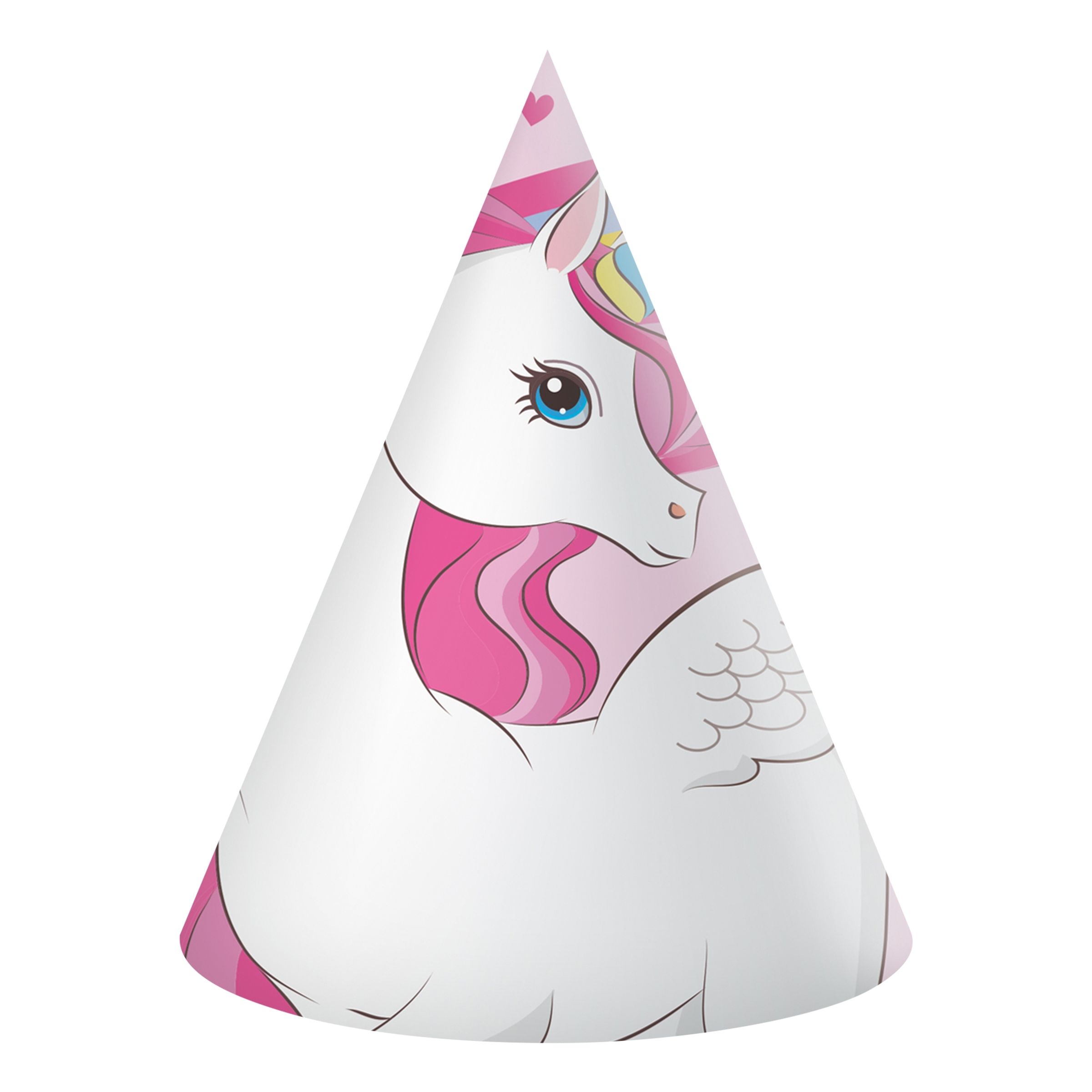 Partyhattar Unicorn innehåller 6 stycken partyhattar för festsugna gäster. Hattarna är ca 16 cm höga och tillverkade av papper. Hålls på plats med hjälp av elastiskt gummiband. Perfekta accessoaren på barnkalaset som höjer stämningen!
