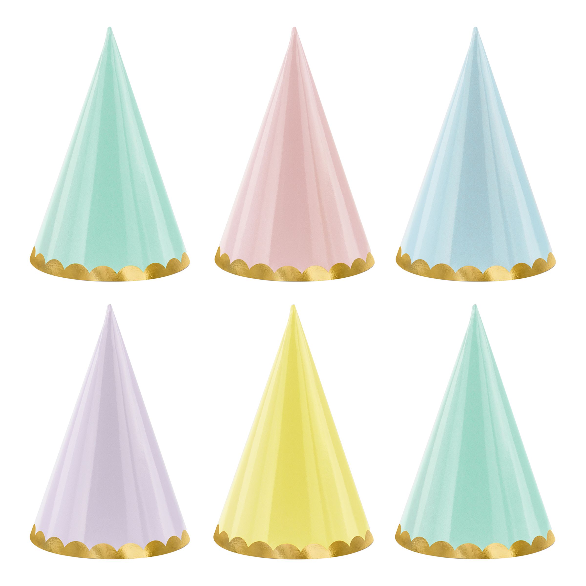Partyhattar Yummy inkluderar sex stycken kalashattar som kommer i olika pastellfärger med en guldkant nedtill. Hattarna hålls på huvudet med hjälp av ett elastiskt snöre och passar både barn och vuxna.