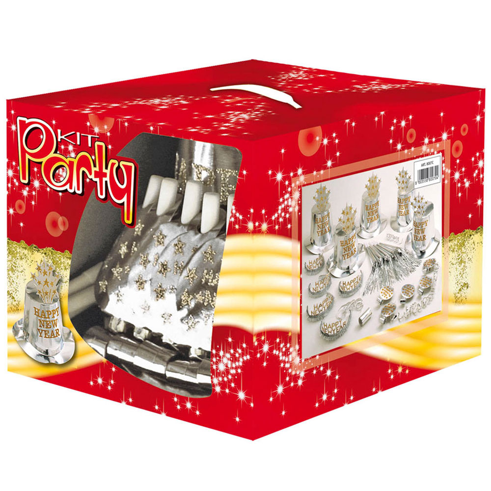 Fullända nyårsfesten med detta roliga partykit! Ett festligt kit med nyårshattar, nyårsdiadem, blåsormar, partytutor och serpentiner i snyggt silver som helt klart livar upp hela festen. kort sagt ett perfekt partykit för dig som söker matchande nyårstillbehör i guld.