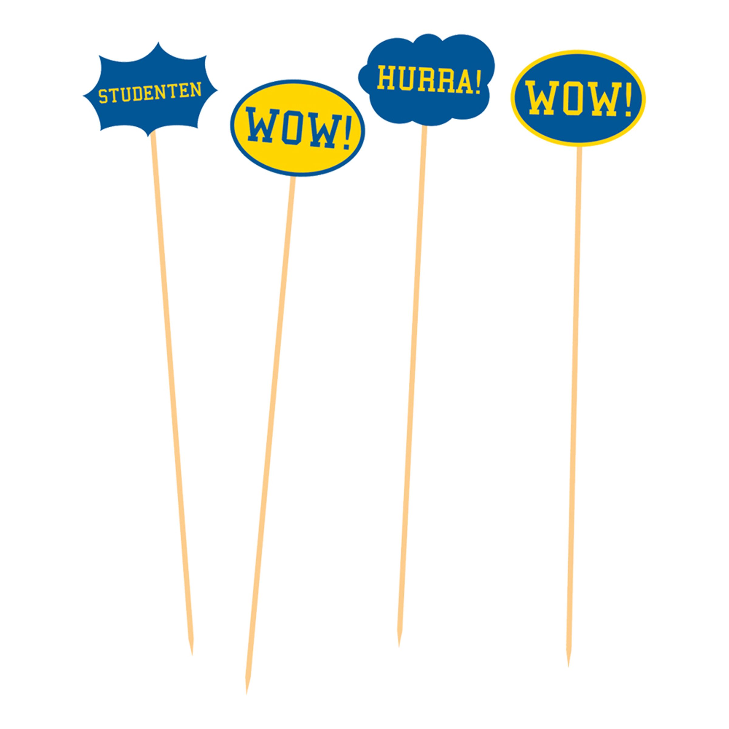 Partypicks Studenten är ett gäng partypicks med helroliga motiv. De kommer med motiv som "wow, studenten och hurra" i färgerna blå och gul! Riktigt festligt tycker vi!