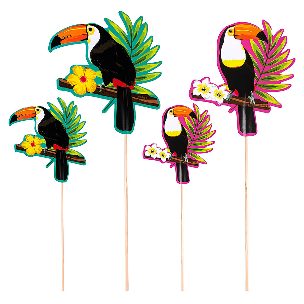 Partypinnar Tropisk Fågel omfattar ett paket med 4 stycken cocktailpinnar med tropiska fåglar eller så kallade tukaner på.