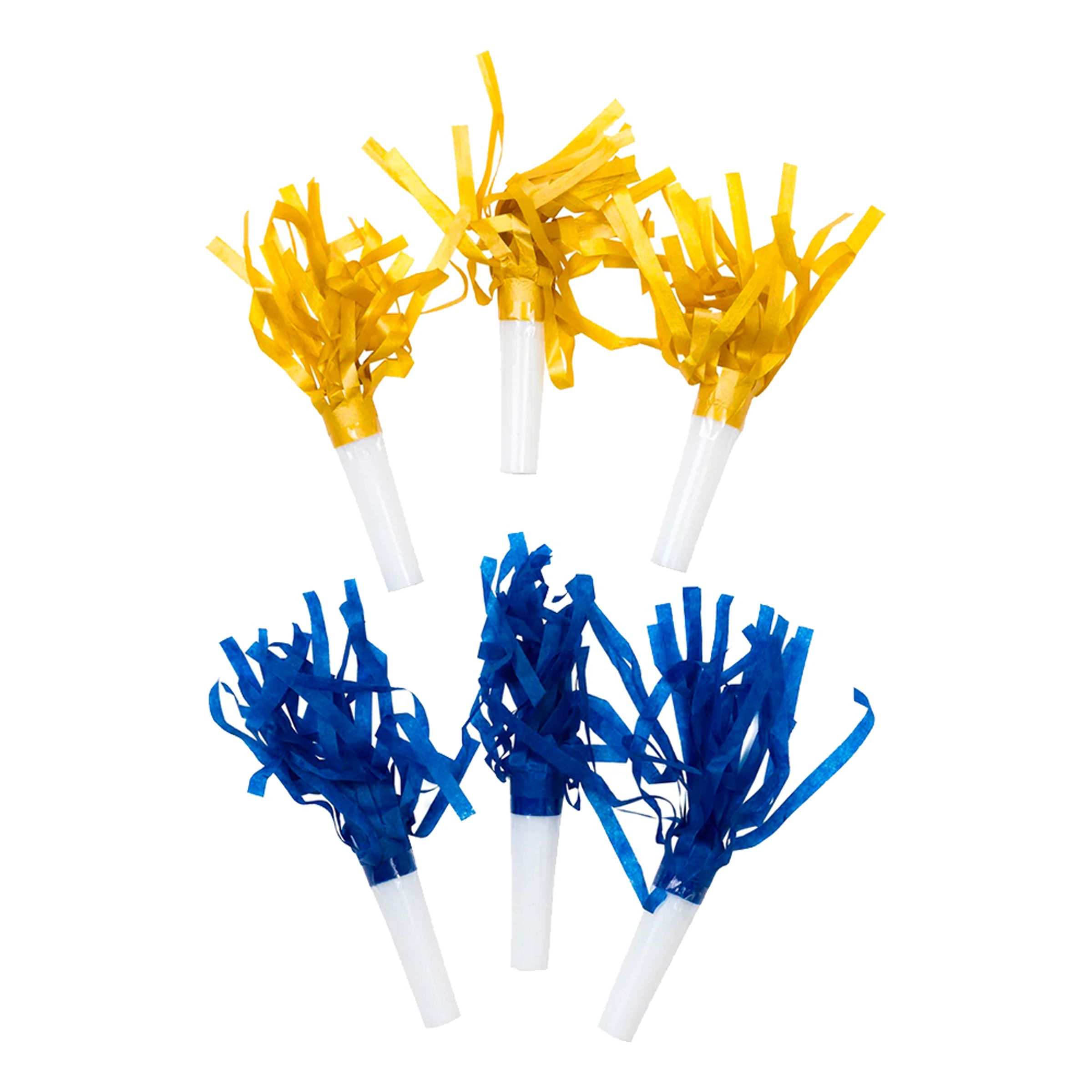 Partytutor Blå/Gul består av sex partytutor med fransar i gul och blå färg. Ypperliga festtillbehör när det ska firas på tolvslaget, födelsedagsbarnet ska grattas eller tjutas på studenten!
