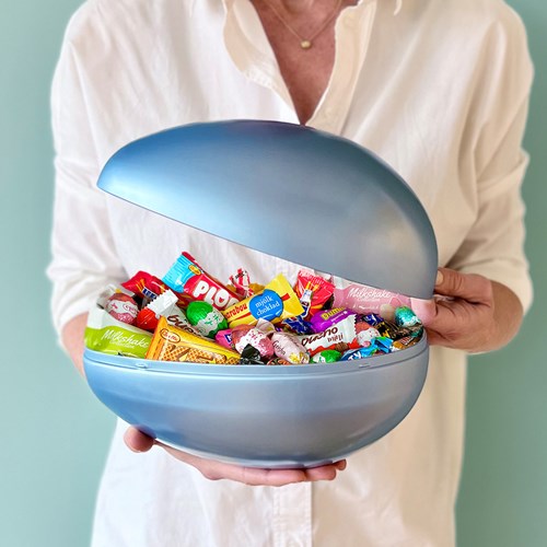 Gör någon glad i påsk och skicka ett stort blått påskägg fyllt med godis och choklad! I detta stilfulla plåtägg finns 1 kg godis som räcker till en hel familj. Det är en blandning av godsaker som Dumle, Geisha, chokladägg, karameller, kolor och massa mer. Ett riktigt generöst påskägg, precis som man vill ha det till påsk!