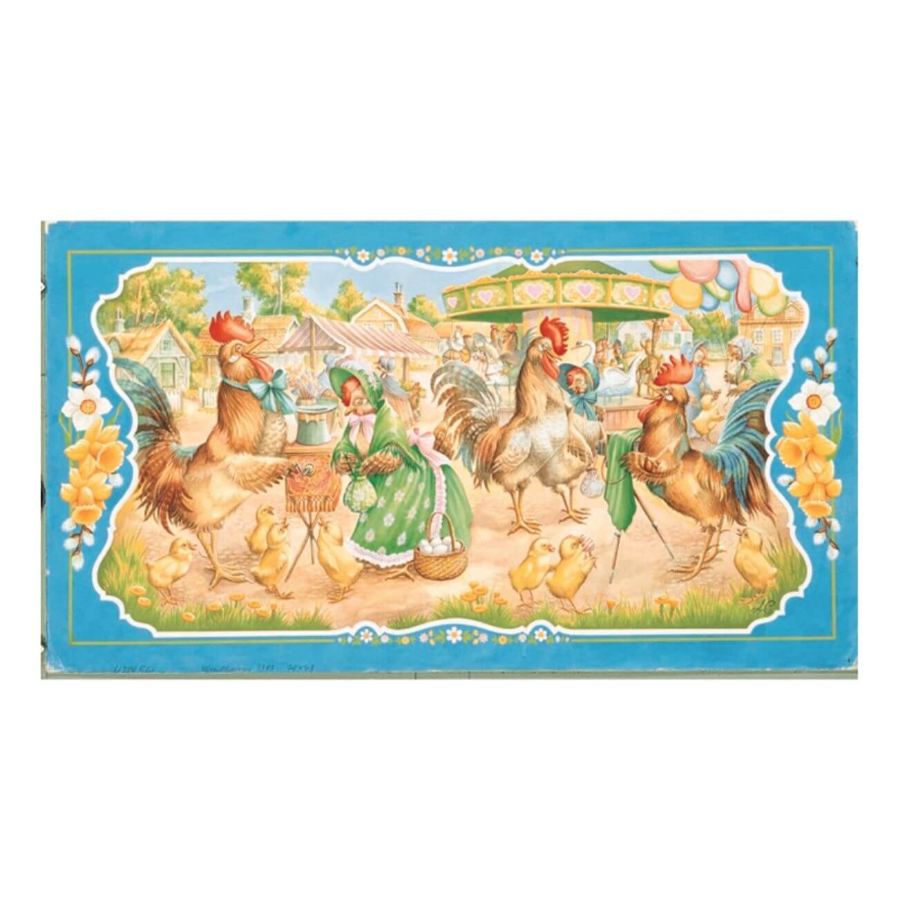 Planschen är i papper och föreställer tuppar, hönor och kycklingar på en påskmarknad med karusell och ballonger.