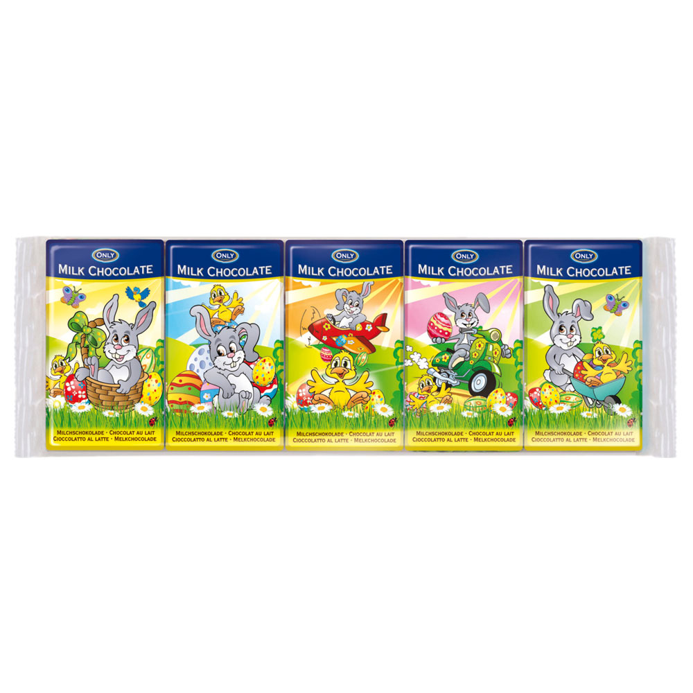 Påskchoklad 5-pack omfattar fem stycken små mjölkchokladkakor med fina förpackningar med påskmotiv.