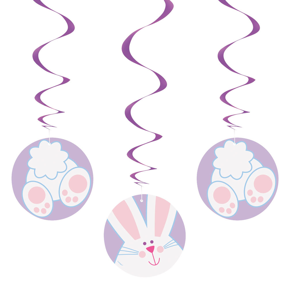 Påskkanin Hängande Dekorationer innefattar flera hängande dekoration med en söt liten påsk kanin på framsidan med en söt liten kanin rumpa på baksidan, dessa hänger i lila virvlar och har en smart upphängningsfunktion.