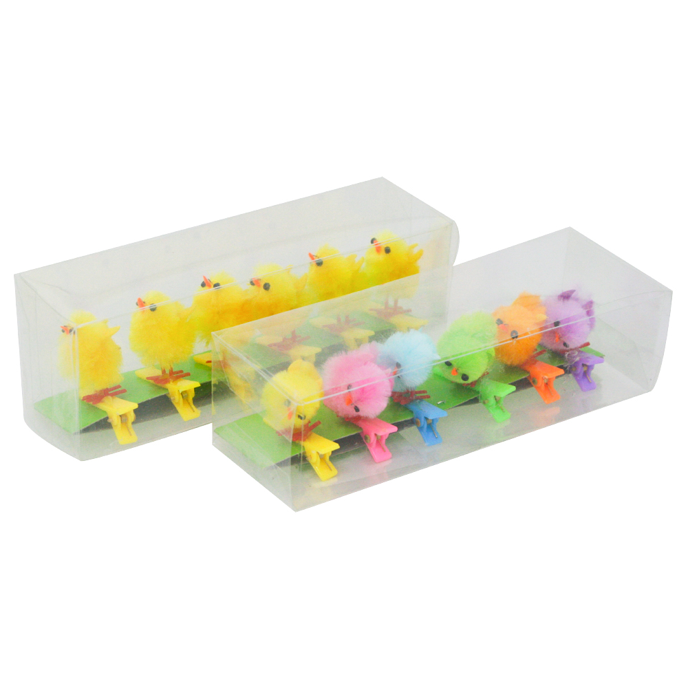 Påskkycklingar Dekorationer omfattar 6 stycken dekorationer med spännen i plast i form av påskkycklingar i polyester. Finns i två olika varianter, ett pack med gula kycklingar och ett i olika färger, vilken färg du får blir en överraskning. Dekorationerna kan fästas i påskriset eller i håret och är ca 3,5 cm höga.