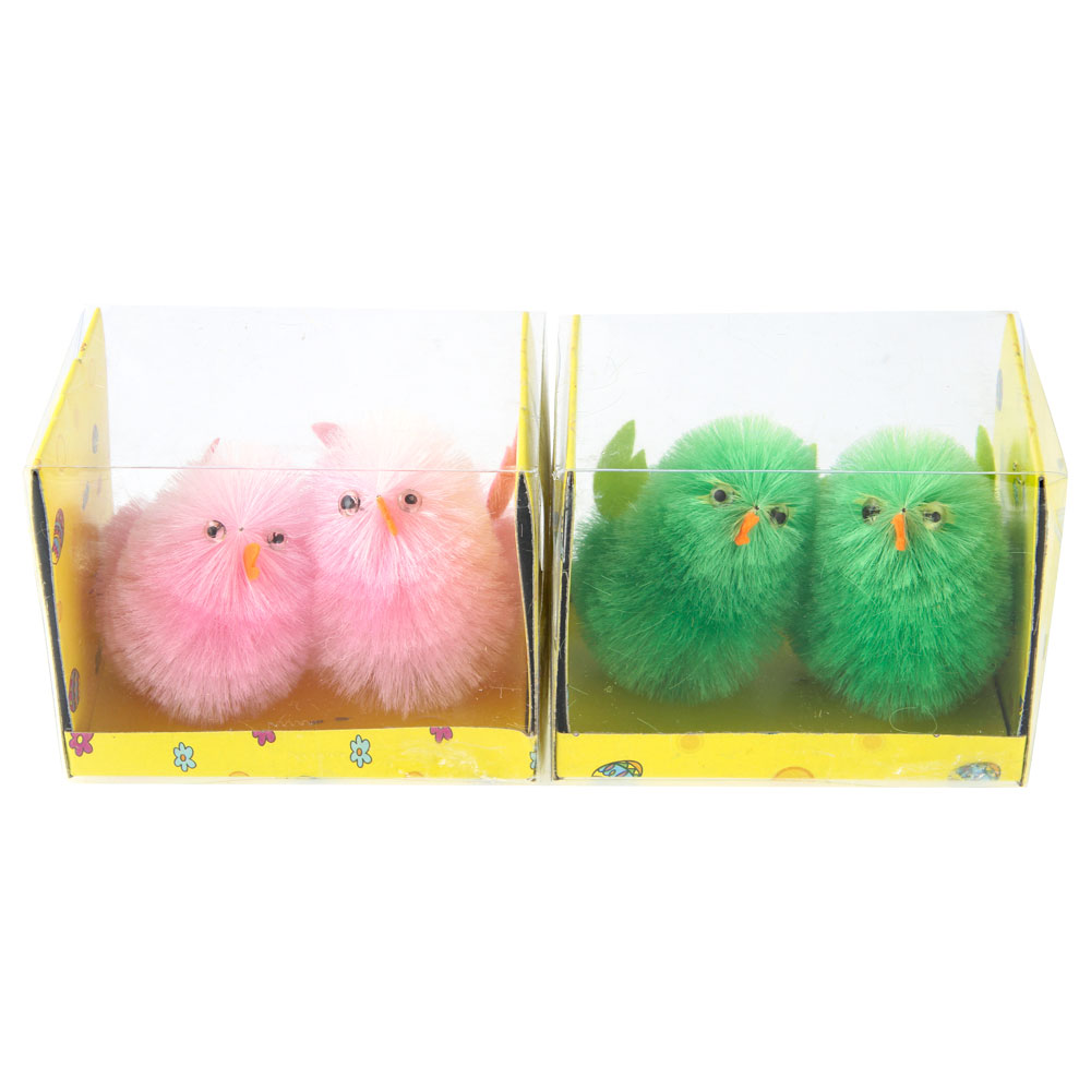 Påskkycklingar omfattar ett 2-pack gulliga påskkycklingar som är ca 7,5 cm höga. Finns i rosa och grönt, vilken färg du får blir en överraskning.