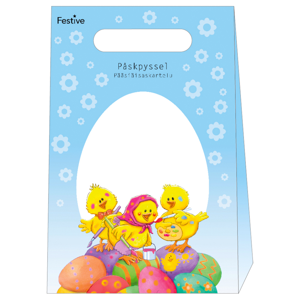 Påskpyssel Kycklingar omfattar ett kit med påsk-pyssel för barn med stickers, bilder att färglägga och olika slags pyssel.