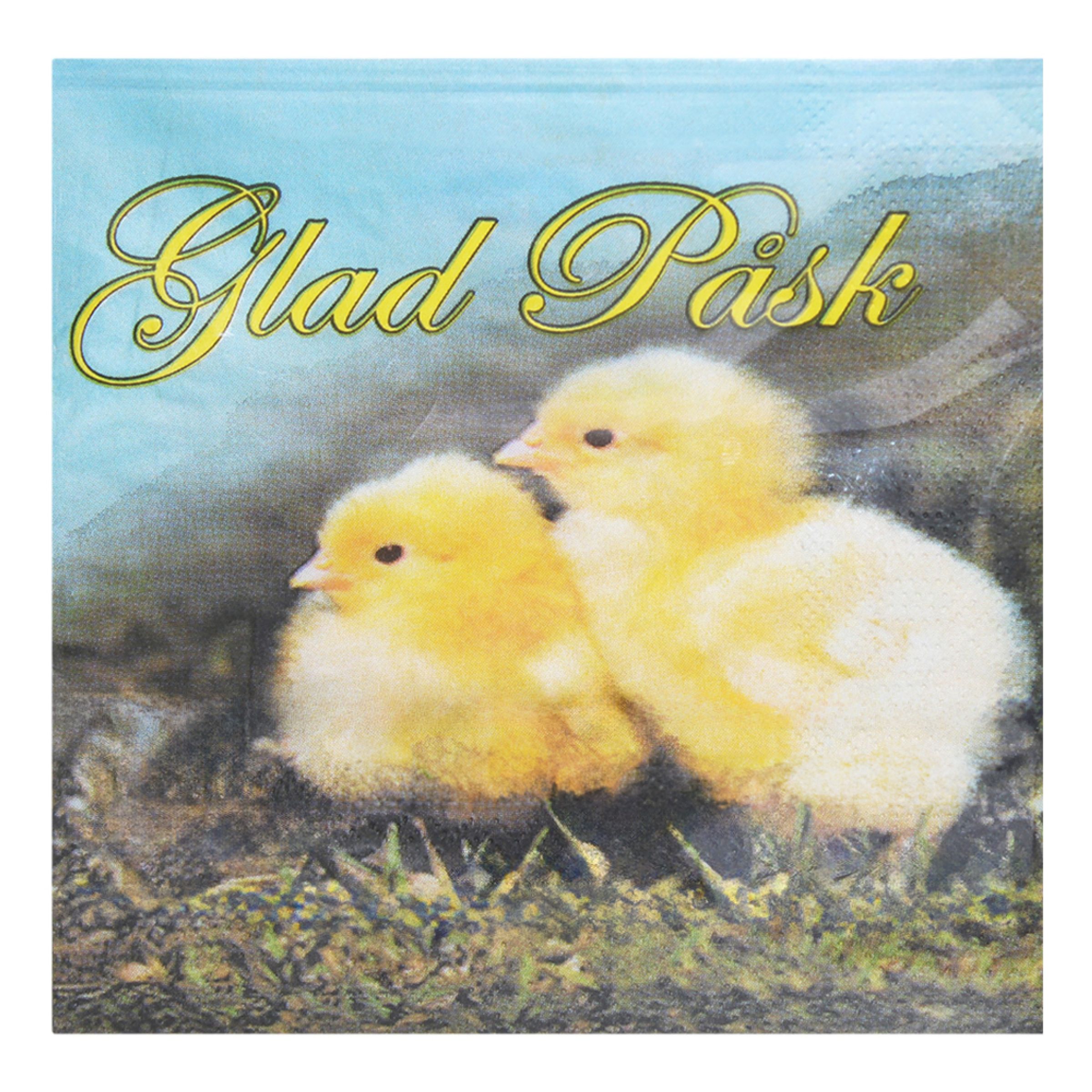 Påskservetter Glad Påsk inkluderar tjugo stycken servetter som kommer föreställande två kycklingar och texten "Glad Påsk". Perfekt till påskdukningen inför påskfesten!