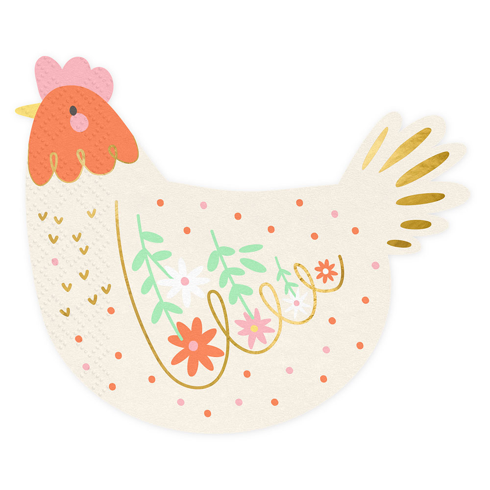 Påskservetter Höna omfattar 20 stycken servetter i form av en höna i fina påskfärger och detaljer.