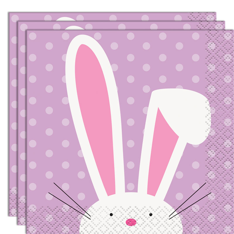 Påskservetter Mini med Påskkanin innefattar ett paket med lite mindre servetter i två lager med rosa bakgrund och en söt påskkanin.