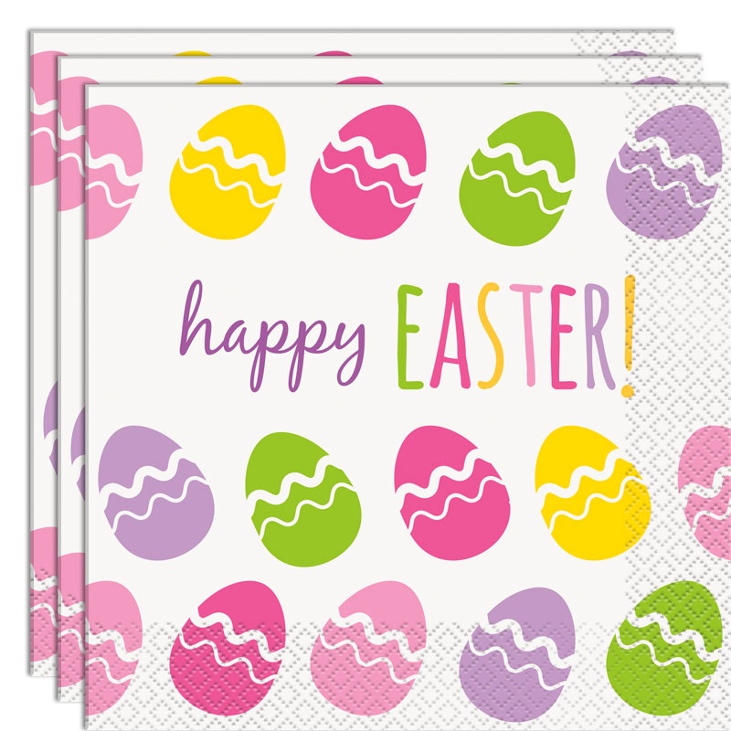 Påskservetter Påskägg Happy Easter omfattar ett paket med servetter i två lager, dessa är dekorerade med ljusa påskägg och orden Happy Easter.
