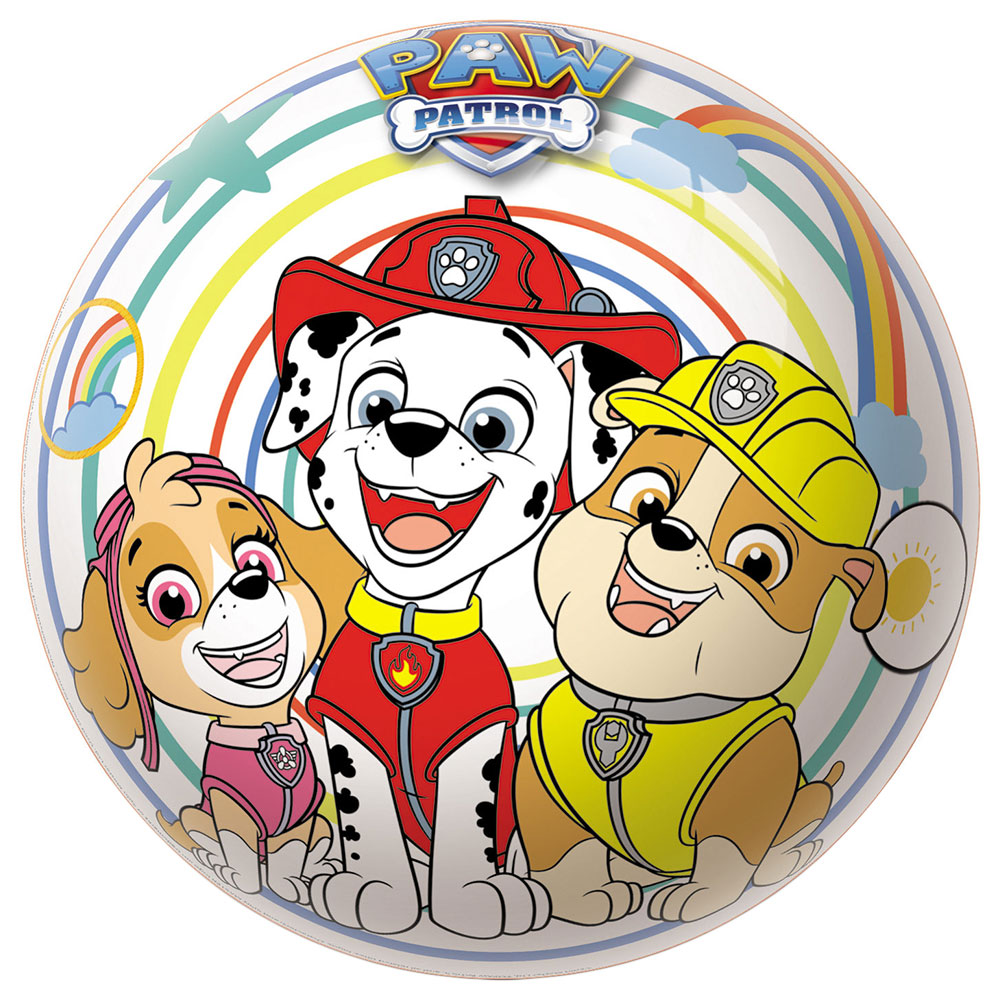 Paw Patrol Boll omfattar en färgglad boll i plast med motiv av olika karaktärer från Paw Patrol-serien på båda sidor av bollen.