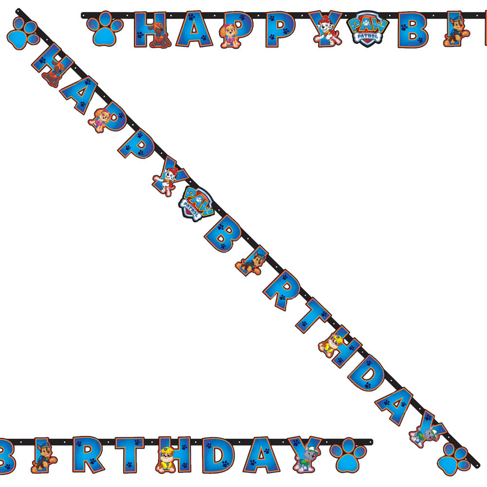 Paw Patrol Happy Birthday Banderoll består av en festlig blå Happy Birthday banderoll med tassar, Paw Patrol logga och motiv av hundarna från Paw Patrol. Banderollen hängs enkelt upp i exempelvis taket eller mot en vägg i snören. Tillverkad i papp.