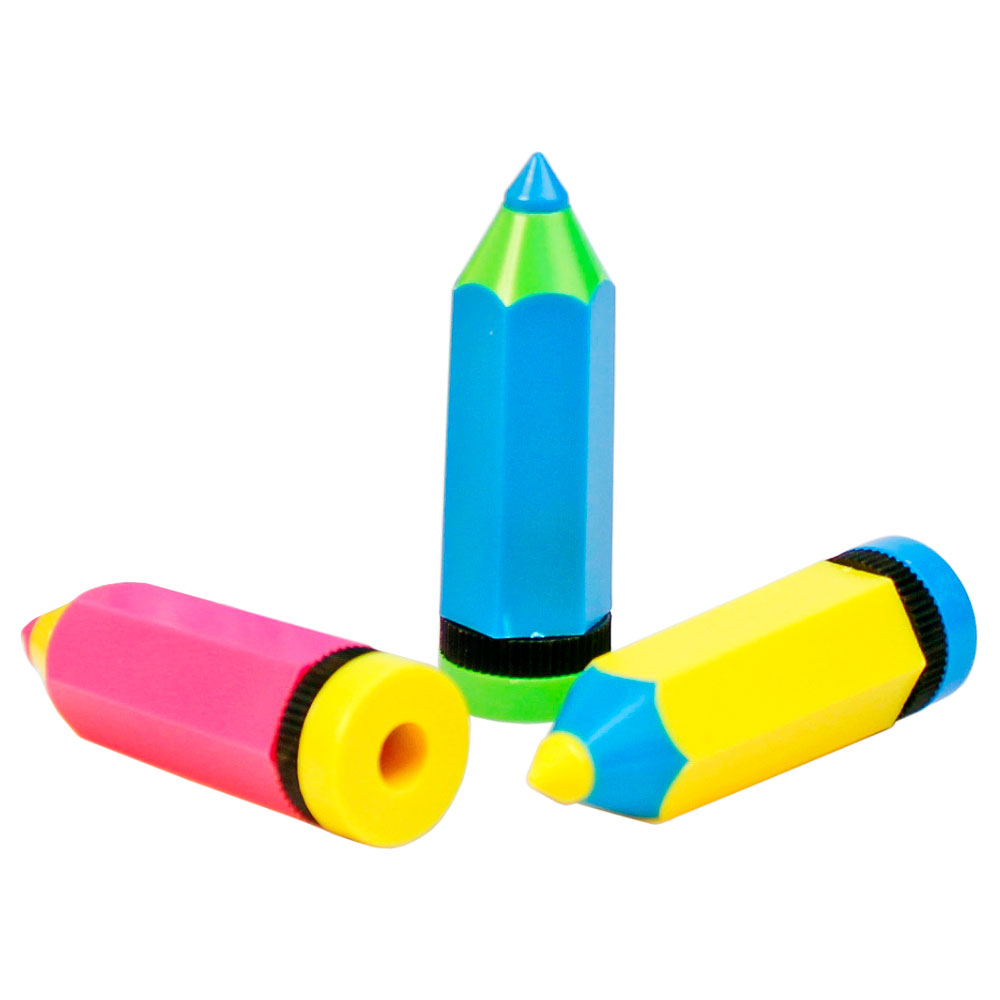 Pennvässare Färgglada består av pennvässare som ser ut som pennor. En pennvässare mäter ungefär 7,5 centimeter i längd samt har en diameter på nästan 2,5 centimeter. Tillverkade av plast. Säljs i 3 pack.