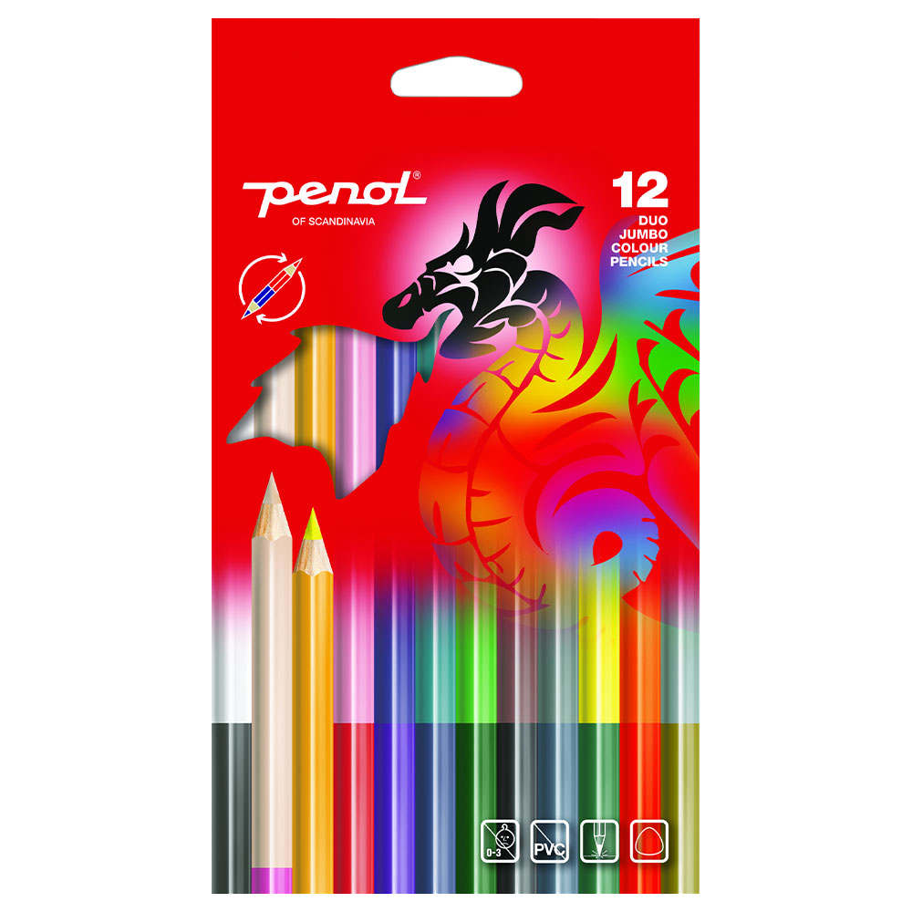 Penol Dubbelsidiga Jumbo Färgpennor 12-Pack är perfekta för att belysa din kreativa sida. Dessa färgläggningspennor erbjuder inte bara en, utan två färgglada sidor att använda för att få dina konstverk att komma till liv. Den unika triangulära formen tillåter ett fast och bekvämt grepp, vilket gör dem till utmärkta målarpennor för både yngre och äldre konstnärer. Oavsett om det är akvarellmålning eller detaljerade skisser, låt din inspiration flöda med detta paket av tolv extra stora pennor.