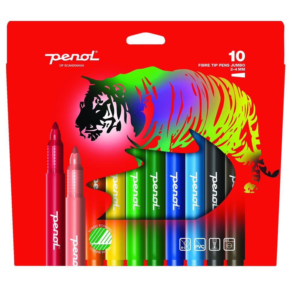 Penol Jumbo Tuschpennor 10-Pack omfattar tio extra stora filtpennor med en bred fiberspets som går mellan 2-4 mm. Pennorna är tillverkade av 100% återvunnet plast med ett ventilerat lock och vattenbaserat tvättbart bläck.