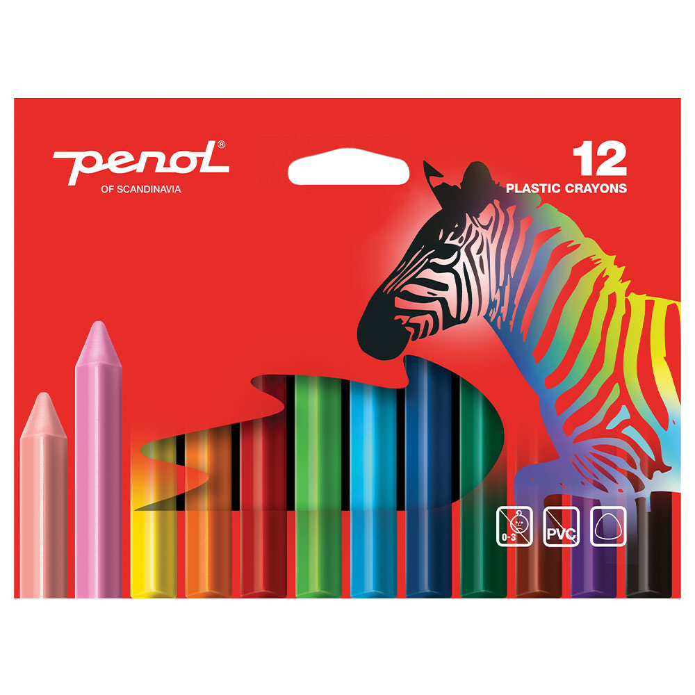 Penol Plast Vaxkritor 12-Pack omfattar tolv plastkritor med en triangulär form och ett högt innehåll av färgpigment.