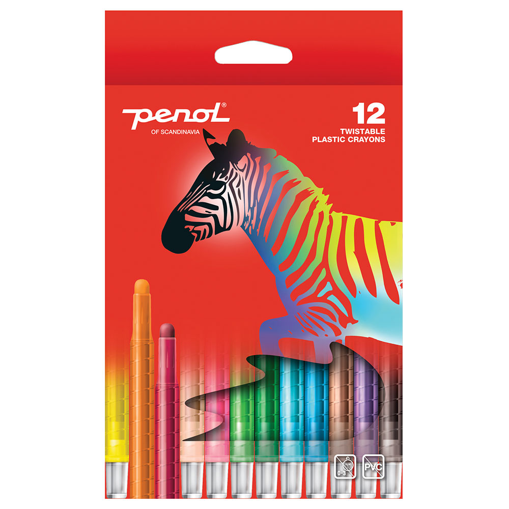 Penol Twister Kritor 12-Pack omfattar tolv vaxkritor i plasthållare – som håller kritorna hela och motverkar att färg hamnar direkt på handen. Vrid upp kritan allt eftersom det behövs.