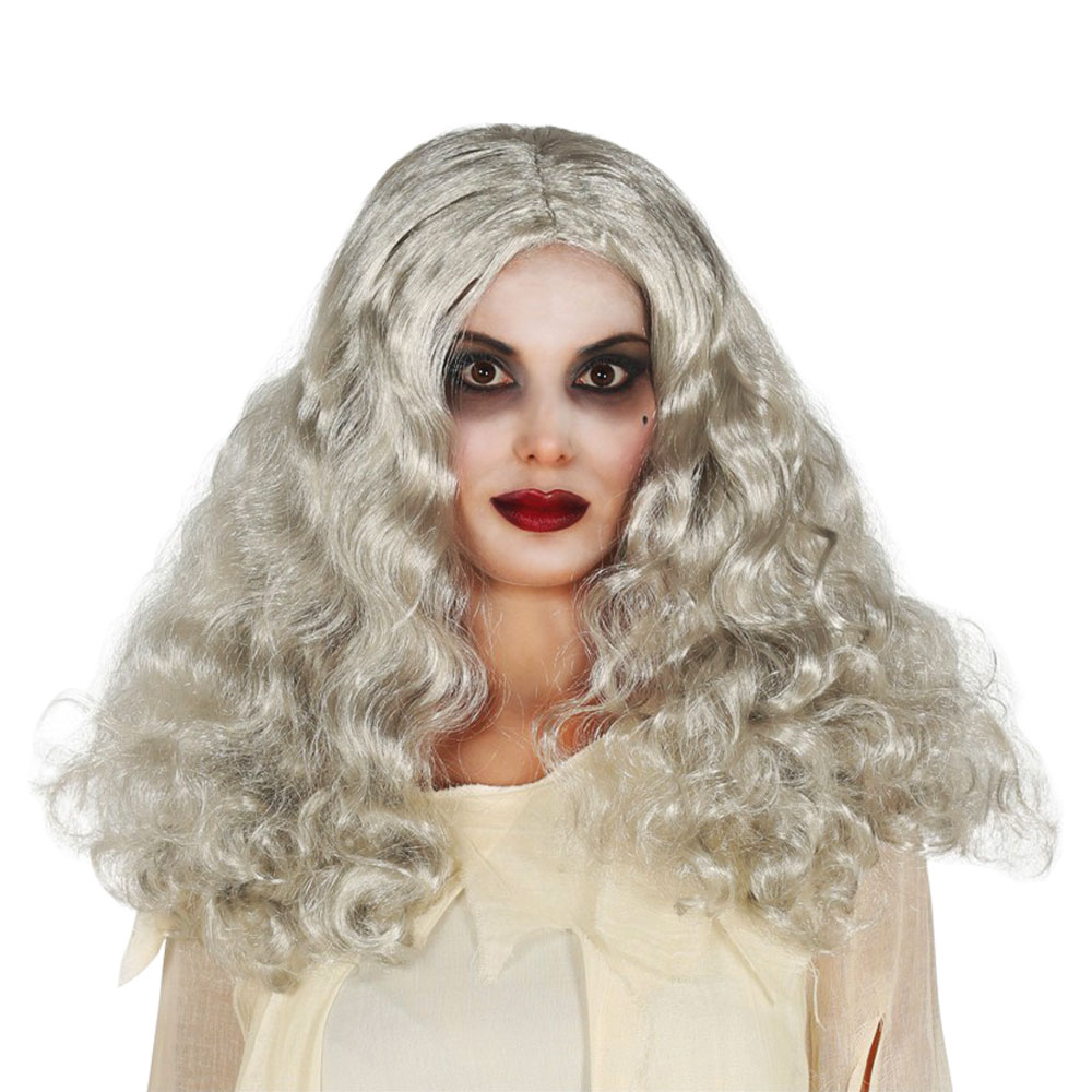 Oavsett om du ska förvandla dig till ett spöke till Halloween eller gammal gumma på maskeraden är den här silvergrå peruken helt rätt. En syntetisk peruk med krulligt silverfärgat hår som passar perfekt som en spökes färglösa frisyr eller någon annan kuslig vandöd.