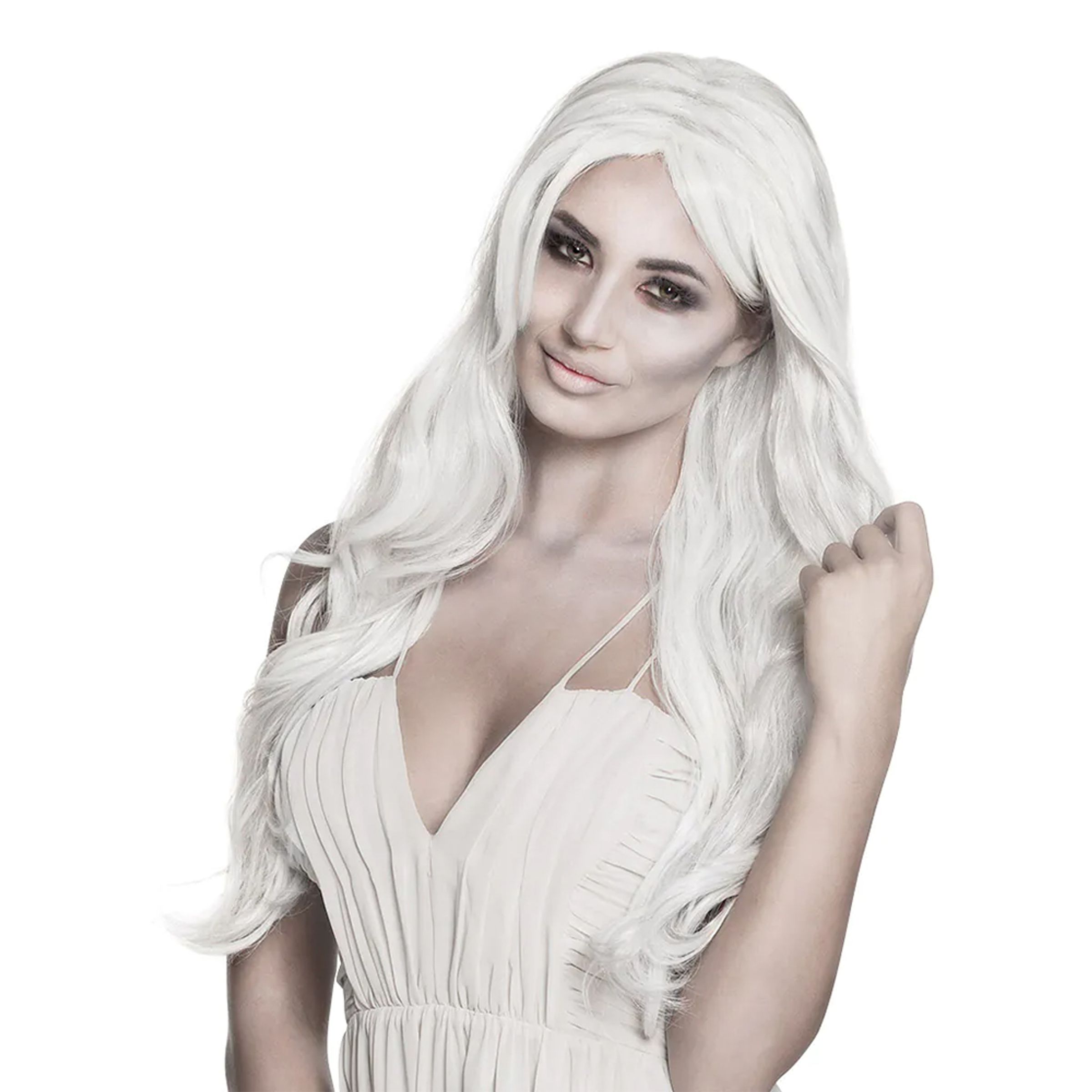 Peruk Spökprinsessa är en vit peruk med långt, vågigt hår. Den sätts enkelt på huvudet. Kommer i one size för vuxna.