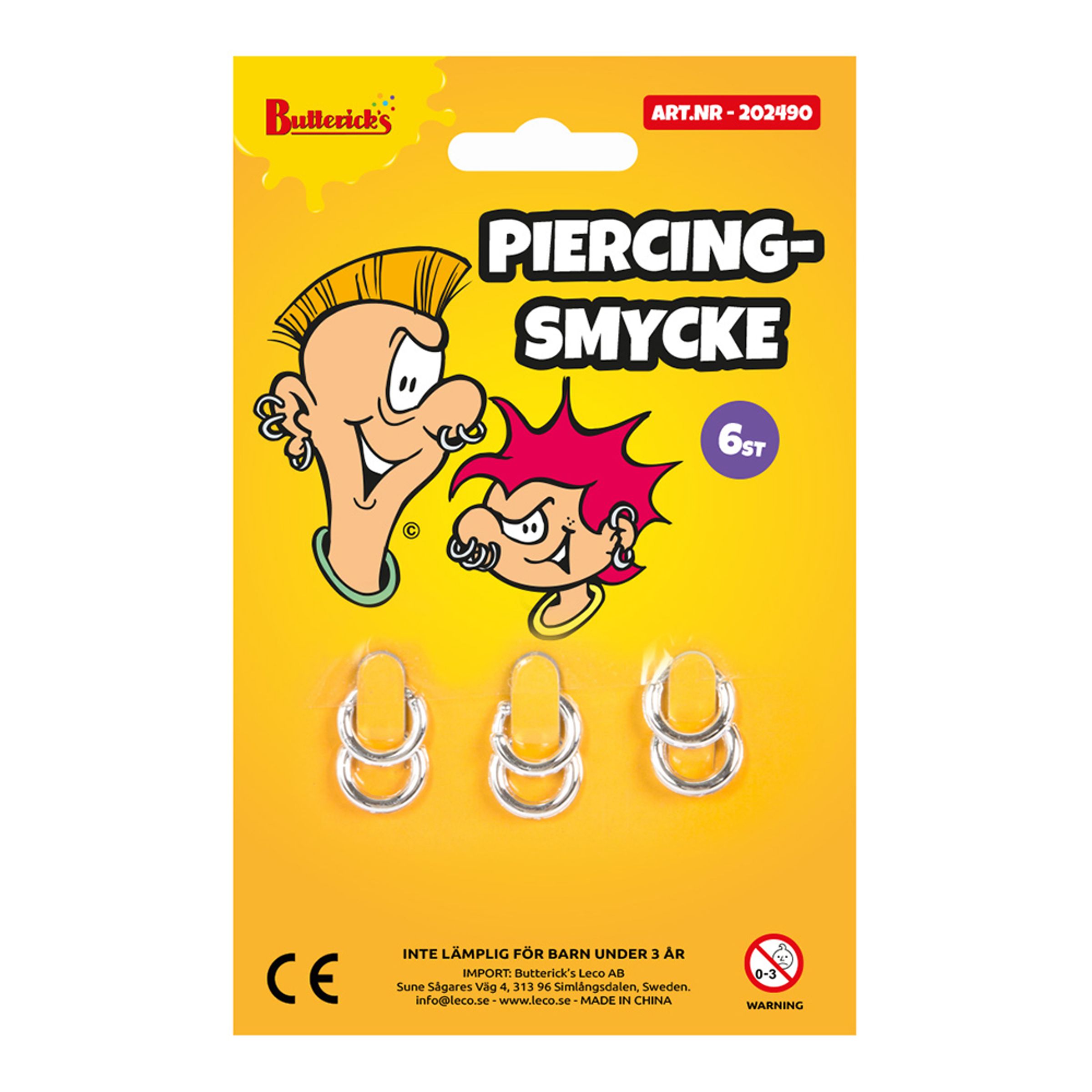 Piercingsmycken säljes med 6st ringar i varje paket och fästes enkelt på valfri ansiktsdel. Passar lika bra till bus som till punkmaskeraden.