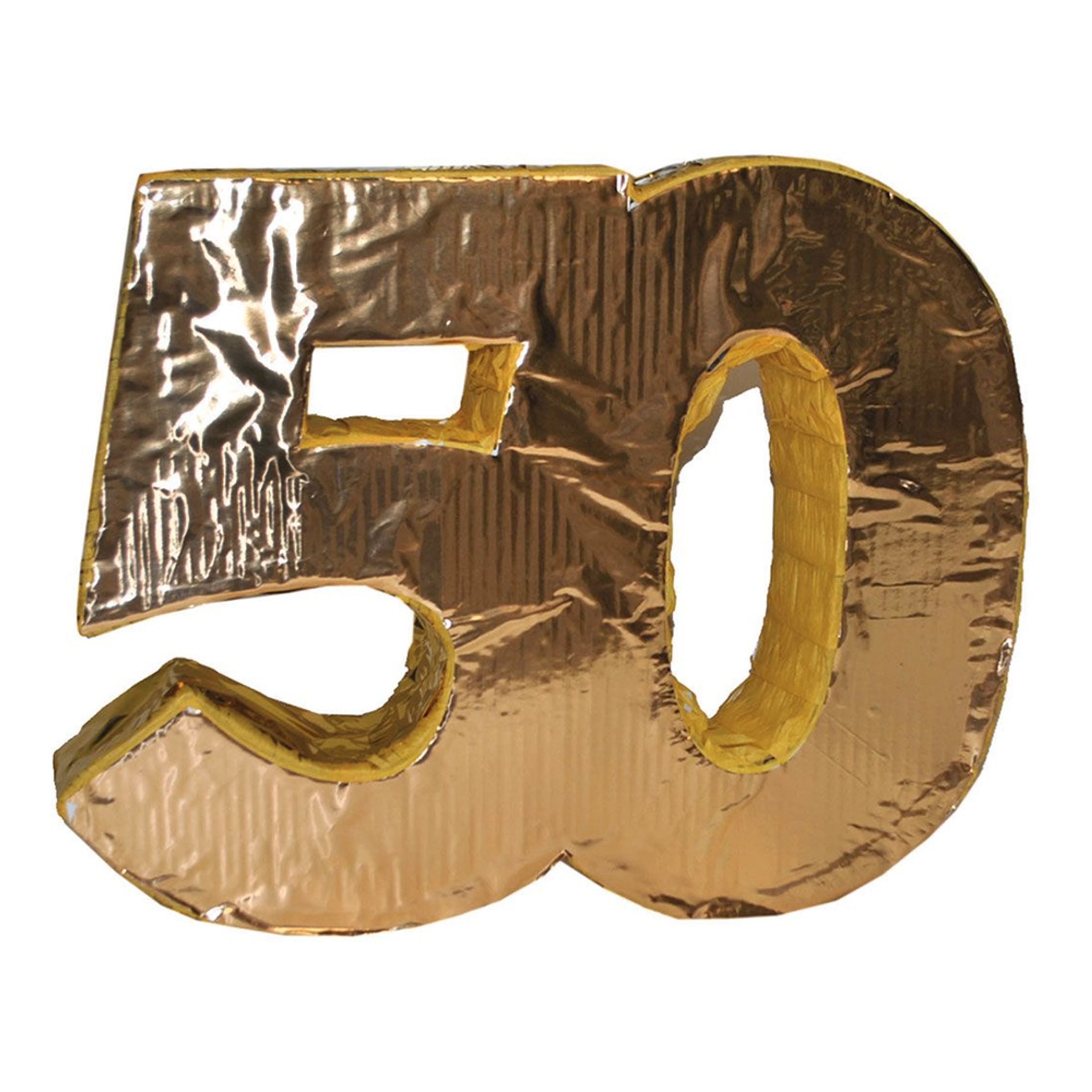 Överraska den nyblivne 50-åringen på dagen med denna supersnygga och guldfolierade piñata! På piñatan står det "50" och det kan väl knappast missförstås? Släng på födelsedagsbarnet en ögonbilden, lägg en pinne i handen och njut medans 50-åringen försöker slå sönder den.