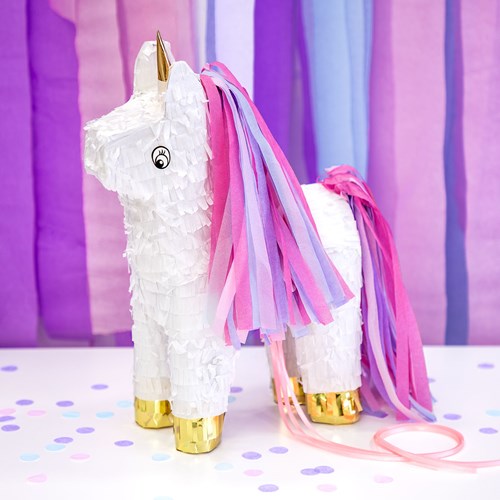 Den här söta piñatan är formad som en enhörning och kan fyllas med godis och konfetti. Häng upp piñatan i taket, hämta en kvast eller något annat att slå med och låt gästerna gå loss tills rummet fylls av ett godisregn! Du väljer själv vilket godis som ska vara i (ingår ej).