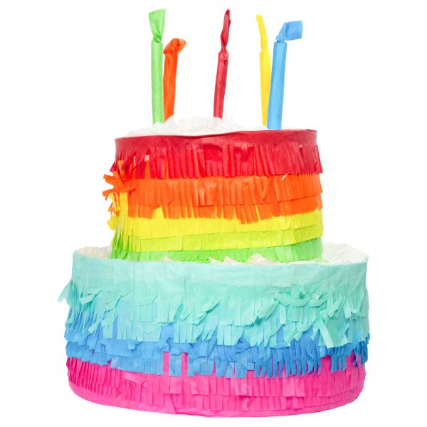 Pinata Regnbågs Tårta med Ljus omfattar en pinata i regnbågsfärger formad som en tårta med tillhörande, uppstickande ljus i papp. Pinatan har en plastögla för upphängning och fylls med valfritt innehåll via tårtans övre del. Åtta stycken ljus medföljer och sätts fast på tårtans övre och undre del. Observera att ljusen är i papp.