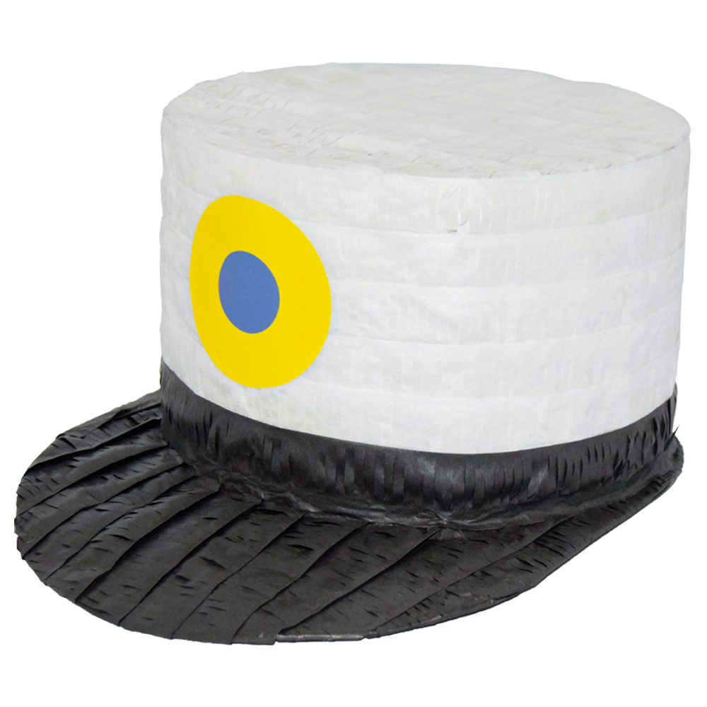Pinata Studentmössa omfattar en pinata i form av en klassisk studentmössa i vitt med svart skärm och emblem i gult och blått. Pinatan fylls med valfritt innehåll via pinatans baksida och har en plastögla på toppen för upphängning.