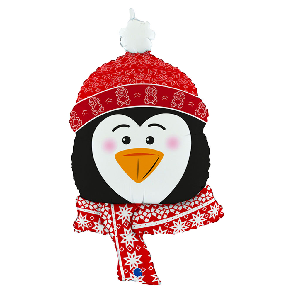 Pingvin Folieballong omfattar en folieballong i form av en svart och vit pingvin med mössa och halsduk i rött med vita mönster.