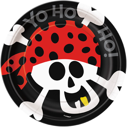 Pirat Assietter är tillverkade av papp och kommer i svart design med en färgglad dödskalle framtill samt texten "Yo Ho Ho!".