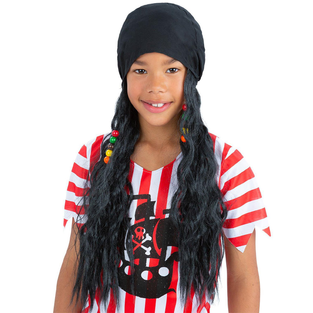 Pirat Bandana med Svart Hår Barn omfattar en svart bandana med perukhår fastsatt som är långt, svart och har färgglada kulor i sig. Perukhåret är inte värmetålig.