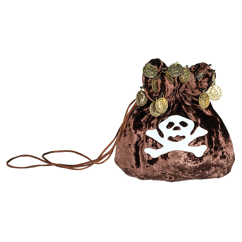 Pirat Dödskalle Påse omfattar en påse i brun sammetsimitation med motiv av en vit dödskalle och guldmynt vid öppningen. Påsen öppnas och stängs med insydda snören.