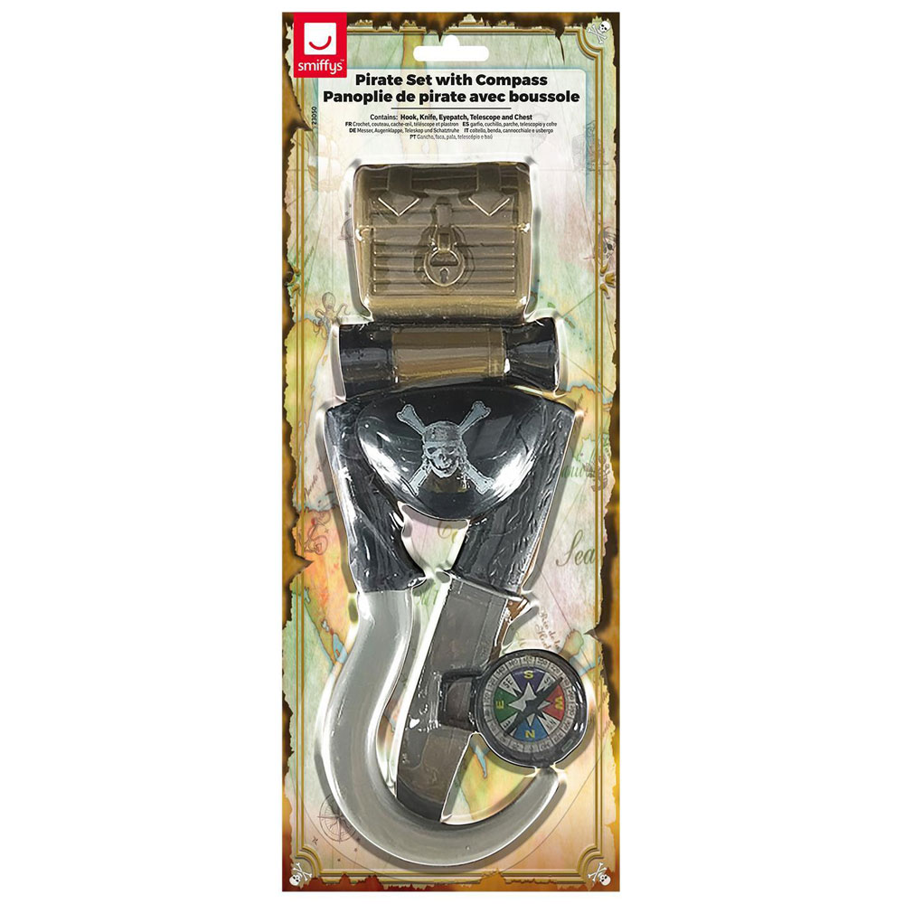 Pirat Kit med Krok omfattar ett kit med en krok, en kniv, en kikare, en skattkista, en kompass och en ögonlapp. Tillverkat i plast.