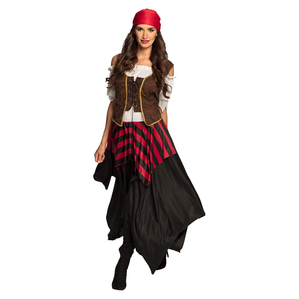 Vill du segla ut på de sju haven i festlig piratdräkt är denna piratklänning något för dig! En snygg utklädnad med pirat klänning, väst med snörning och bandana, perfekt piratkostym för alla som vill vara en festlig pirat på Halloween maskerad och fest med pirattema.