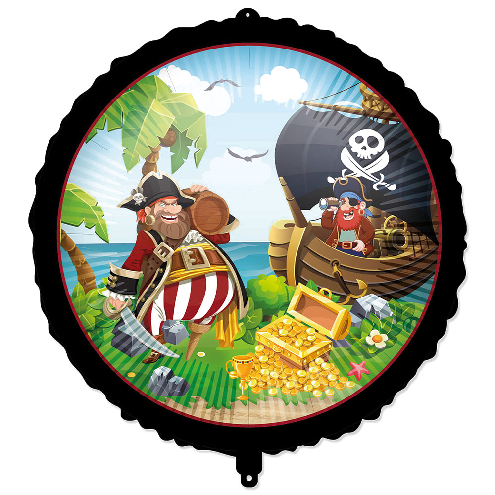 Pirates Island Folieballong omfattar en rund folieballong med motiv av pirater och ett piratskepp på en ö med palmer och en stor skattkista. Ballongen är ca 46 cm stor och kommer även med en ballongvikt och ett 1,5 meter långt ballongsnöre. Ballongen blåses upp med luft eller helium.
