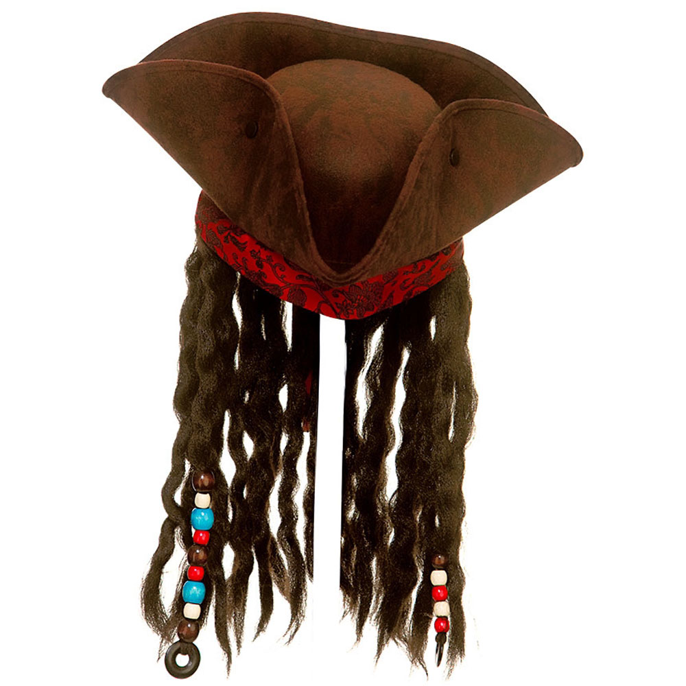 Pirathatt med Peruk Deluxe omfattar en högkvalitativ, mörkbrun pirathatt i tricornestil. Hatten har hängande, svarta dreadlocks med pärldekorationer, samt en röd fastsydd bandana kring huvudpassningen. Hatten har även resårband kring huvudpassningen vilket gör att den sitter som en smäck.