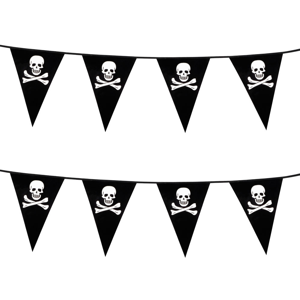 Piratkalas Vimpelgirlang omfattar en vimpelgirlang i plast med svarta vimplar med en döskalle och benkors. Vimpelgirlangen består av 15 vimplar.