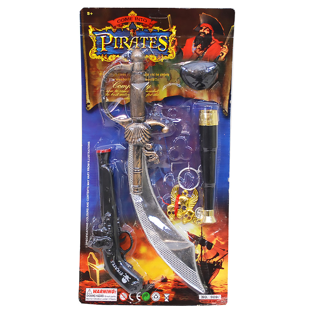Piratleksaker Set omfattar ett piratset med sju olika piratleksaker så som en pistol, ett svärd, en kikare, en ögonlapp m.m. Leksakerna är tillverkade av plast och passar barn från 3+ år.