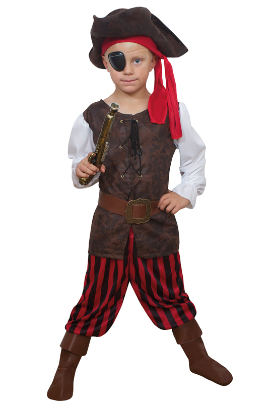 Piratpojke Barn Maskeraddräkt inkluderar en brun överdel med justerbar snörning framtill samt vita ärmar. Ingår gör även ett par matchande byxor, bälte samt en hatt med en röd bandana.