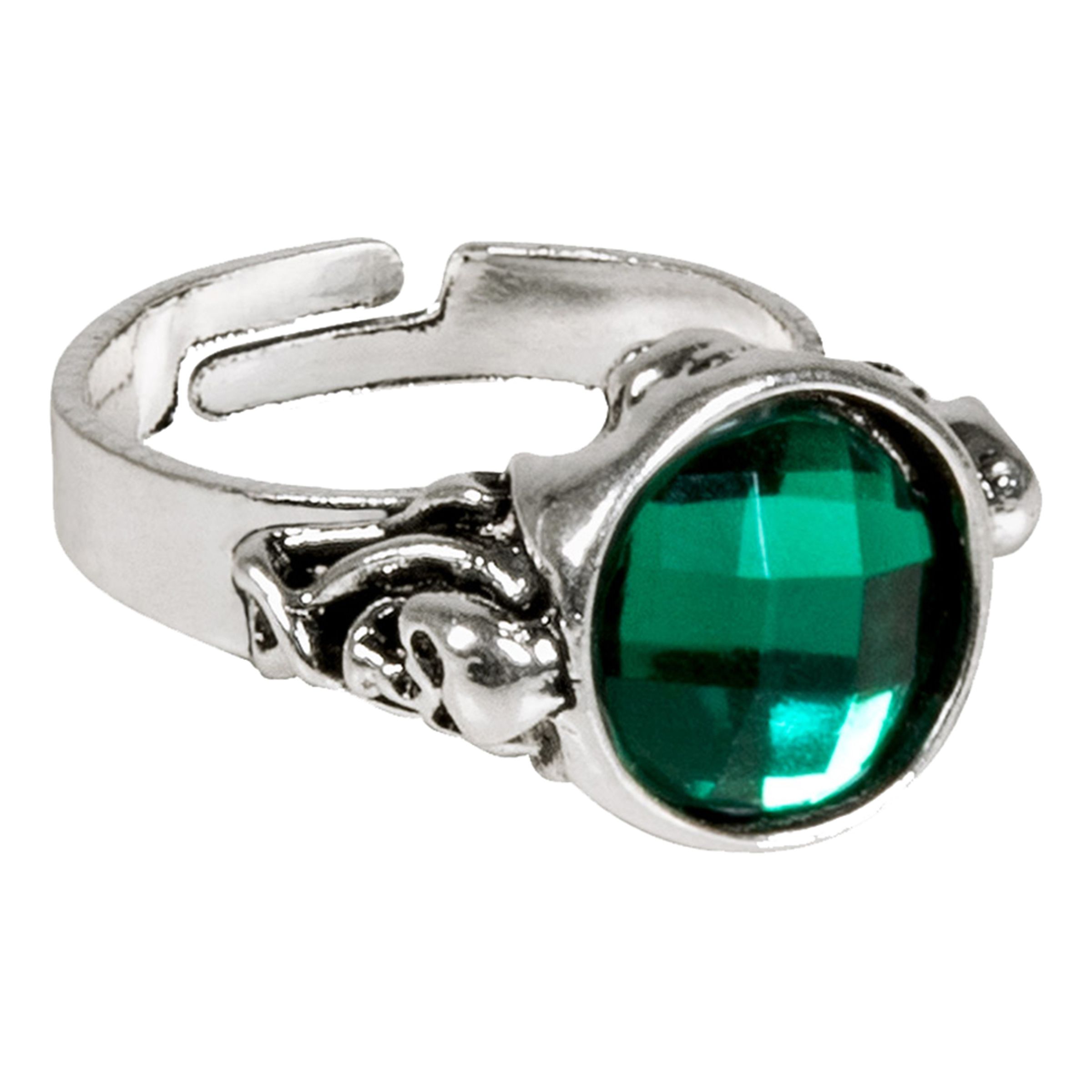 Piratring Grön Sten är en ring i metall som går att justera i storlek. Ringen är dekorerad med döskallar och en grön sten i plast.