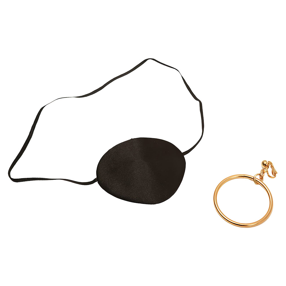Piratset Ögonlapp och Örhänge omfattar ett set med en svart ögonlapp och ett guldigt låtsasörhänge. Örhänget fästs med liten klämma och ögonlappen hålls på plats med hjälp av ett elastiskt band som träs runt huvudet. Tillbehören är tillverkade av plast och polyester och passar vuxna.