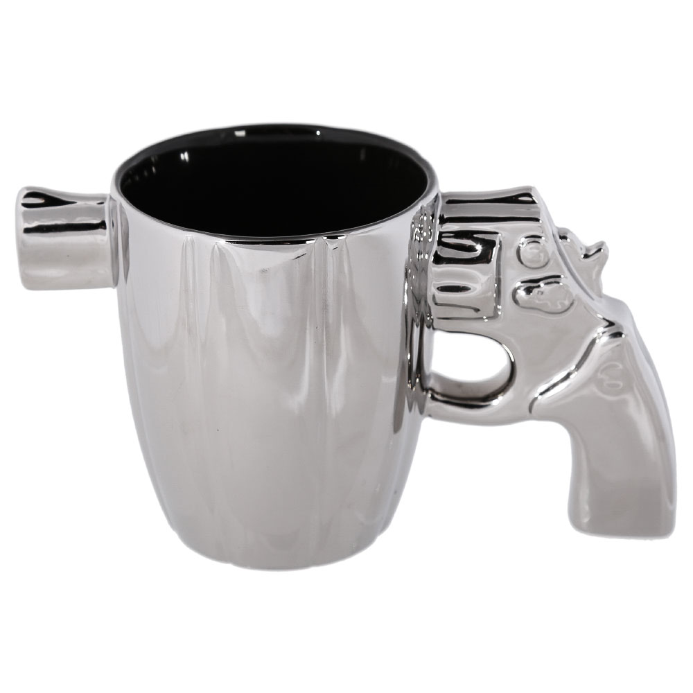 Pistol Mugg Silver består av en mugg med pistol handtag och mynning som kommer ut på koppens motsatta sida. Muggen har en blank krom färgad utsida och är svart inuti. Muggen är 10 cm hög och har en diameter på 8,5 cm. Tål maskindisk.