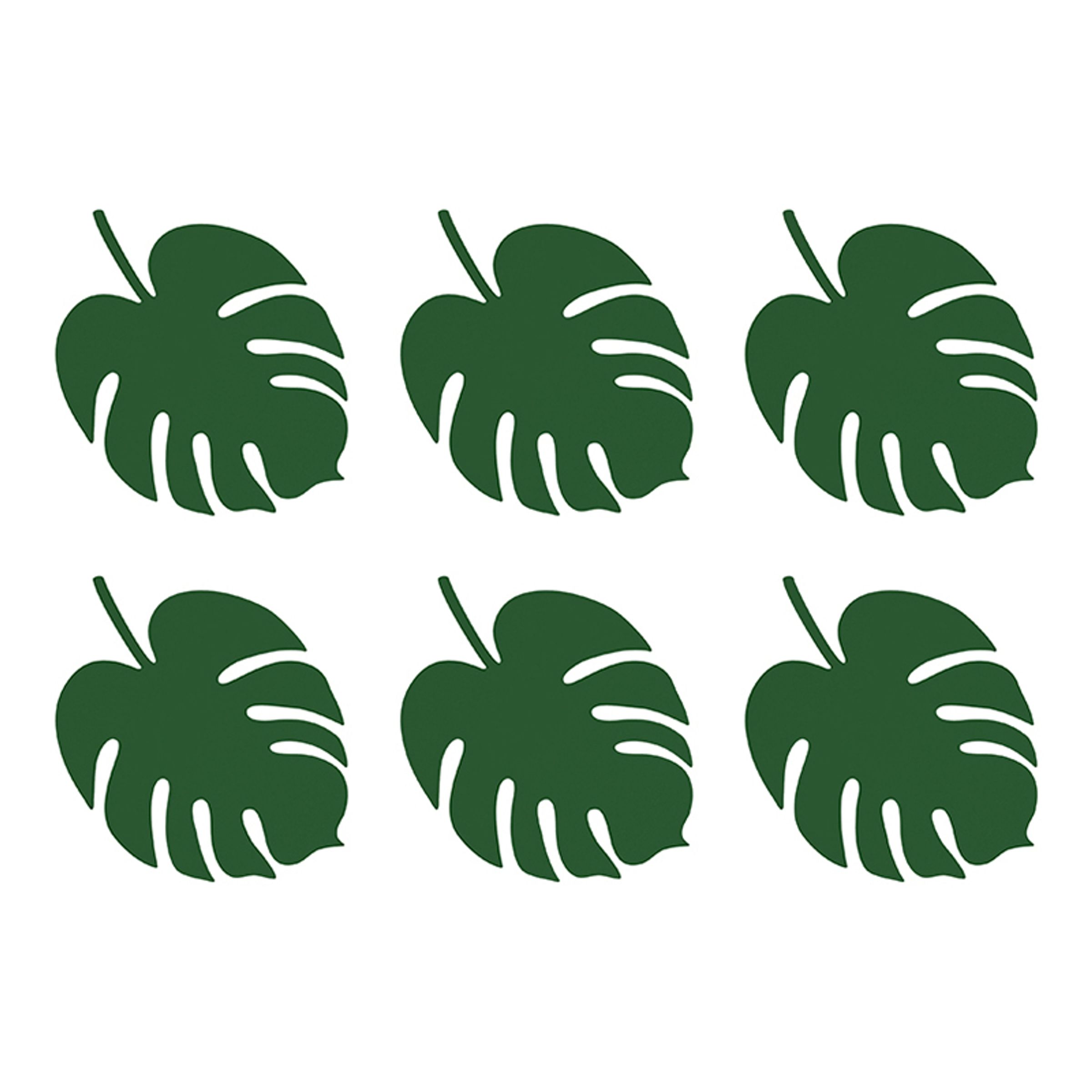 Placeringskort Aloha inkluderar sex stycken gröna pappkort formade som blad. Bladen kan användas som placeringskort och som en bordsdekoration. Det är bara korten som ingår, inget annat som syns på bilden.
