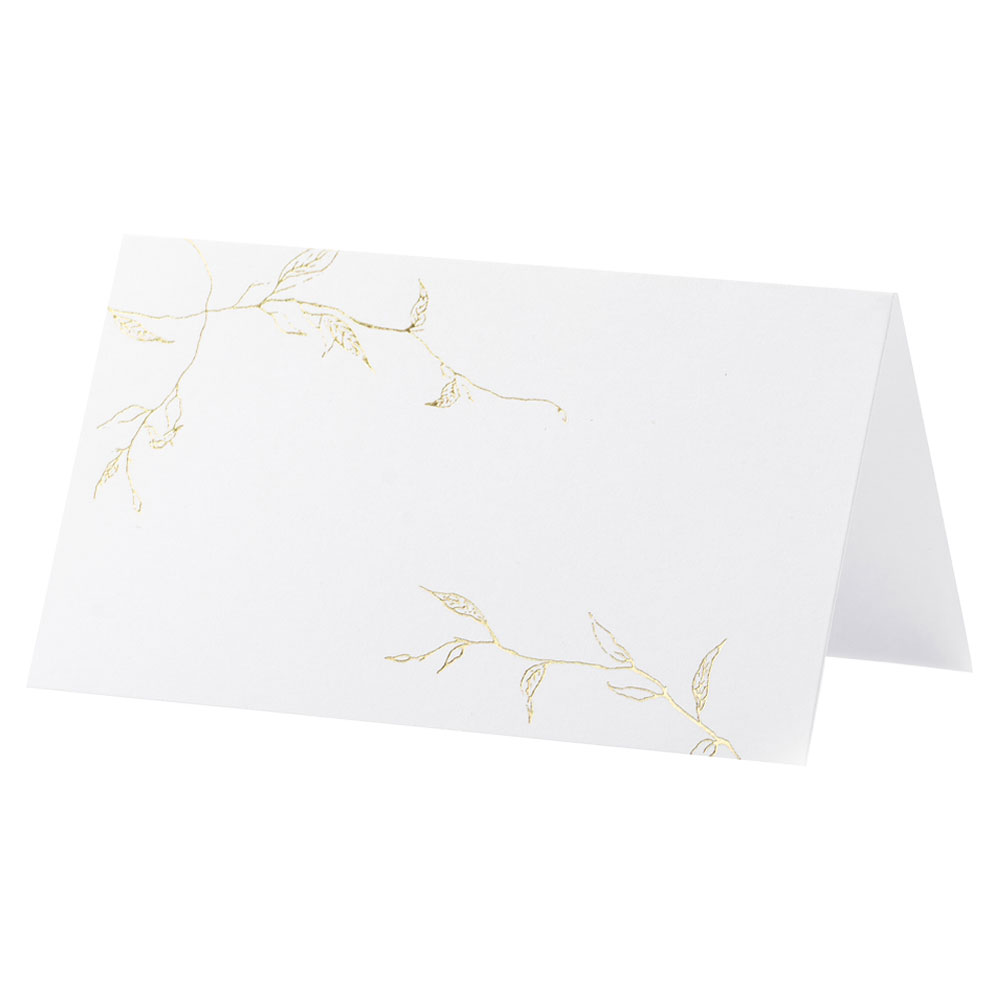 Placeringskort Grenar omfattar ett 10-pack vita bordsplaceringskort med guldiga motiv av grenar. Korten är tillverkade av papp och är ca 5,5, cm höga samt 9,5 cm breda när de är vikta på mitten.